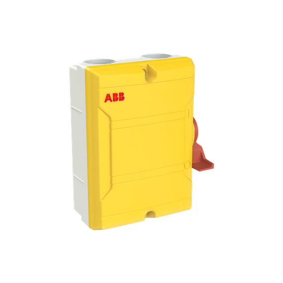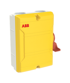 Wyłącznik bezpieczeństwa, 3-bieg. 415 V AC23 25 A, 11 kW. Zamontowany styk pomocniczy: 1NO0NC. Obudowa z tworzywa sztucznego. IP65. Czerwono-żółty uchwyt z napędem bocznym. Pokrywa z blokadą.