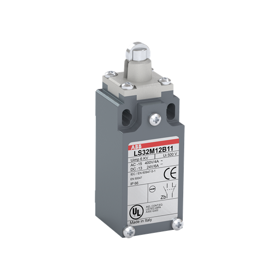 LS32M12B11 to standardowy wyłącznik krańcowy o szerokości 30 mm wykonany ze stopu cynku (Zamak), z 2 otworami montażowymi u góry, 1 wejściem kablowym ISO M16x1,5 u dołu, siłownikiem z rolką stalową i 1 stykiem NO + 1 NC działającym migowo (typ Zb)